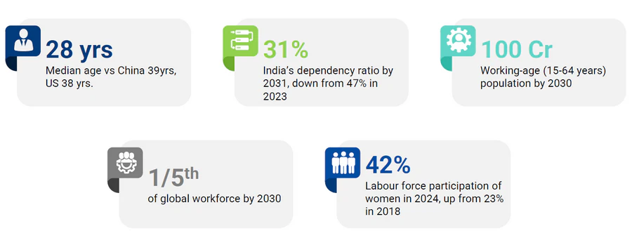1. Demographic Dividend – Over 65% of India’s population is under 35, creating a massive workforce and consumer base.