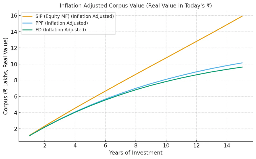 When adjusted for 8% inflation, the real value of PPF and FD returns declines sharply — SIPs retain superior purchasing power over the long term.